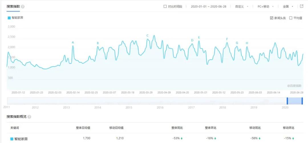 受疫情影响,与去年同期相比,智能家居一词的搜索指数下降了53%。