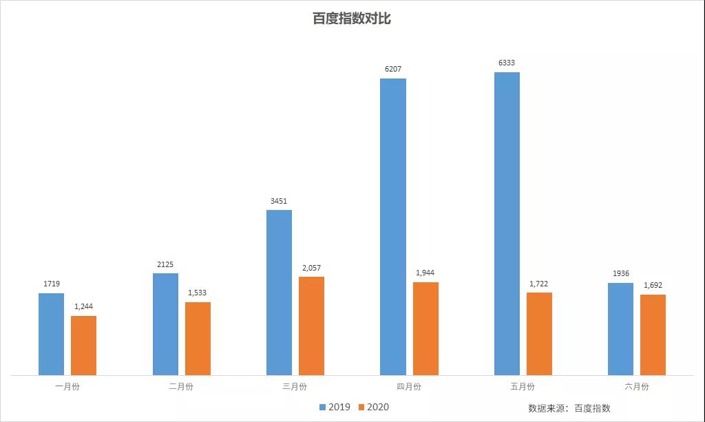 而深入到每个月的数据,受疫情影响,上半年百度搜索指数与去年同期相比降幅不断扩大,从1月份-27%扩大到5月份的-72%到达顶峰,到了6月份降幅收窄至-12%。