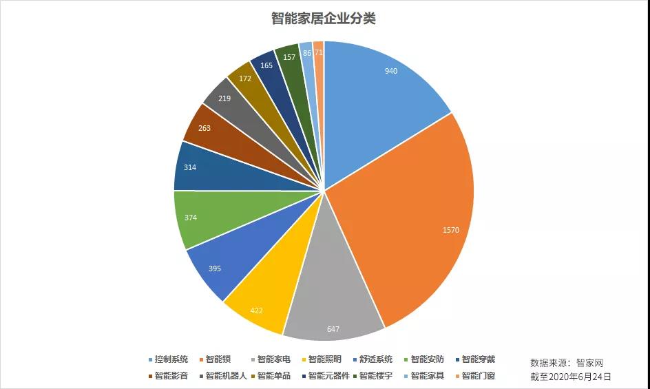 值得注意的是,注册资本在5000万以上的企业共有5682家,占比为2.5%,注册资本在1000~5000万的28031家,占比12.6%,500~1000万的33336家,占比14.9%,500万以下156229家,占比70%。在22万余家智能家居企业中,52.2%的企业属于批发和零售业,11.5%的企业为信息传输、软件和信息技术服务业,11.4%属于建筑业,10%为科学研究和技术服务业,6.7%属于制造业,其他行业占比8.2%。 那么这些智能家居企业都是做什么方向的呢?智家网目前收录了5695家智能家居的企业,在这些企业中,做智能锁、智能家居系统、智能家电、智能照明、舒适系统、智能安防占据了大约75%的比例。 受种种原因影响,2020年有53家企业选择了注销。