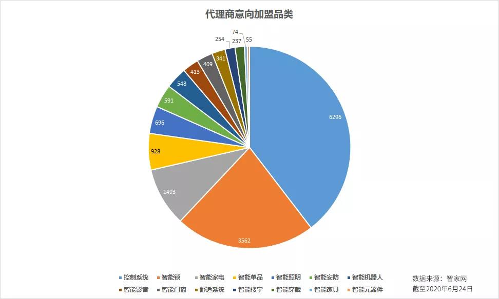隔离期间,人们放下工作回归家庭,更加注重生活品质提升,智能化也是其中之一。有意进入智能家居行业的人同比增加,智家网2020年上半年意向代理商数量为16263,较去年(14123)增长15%! 其中智能家居控制、智能锁、智能家电、智能单品、智能照明、智能安防、智能机器人等品类加盟意向较多,大体与智能家居厂家类型相吻合。 受疫情影响,智能家居企业纷纷采取应对措施上演“绝地求生”,例如加大线上推广、开启短视频营销、直播带货等,同时明星大佬们也加入带货,雷军亲自介绍米家智能家居、罗永浩、薇娅带货智能锁,智能家居消费服务平台智和家完成200万融资,“两会”、新基建均涉及智能家居,为市场带来新的利好。